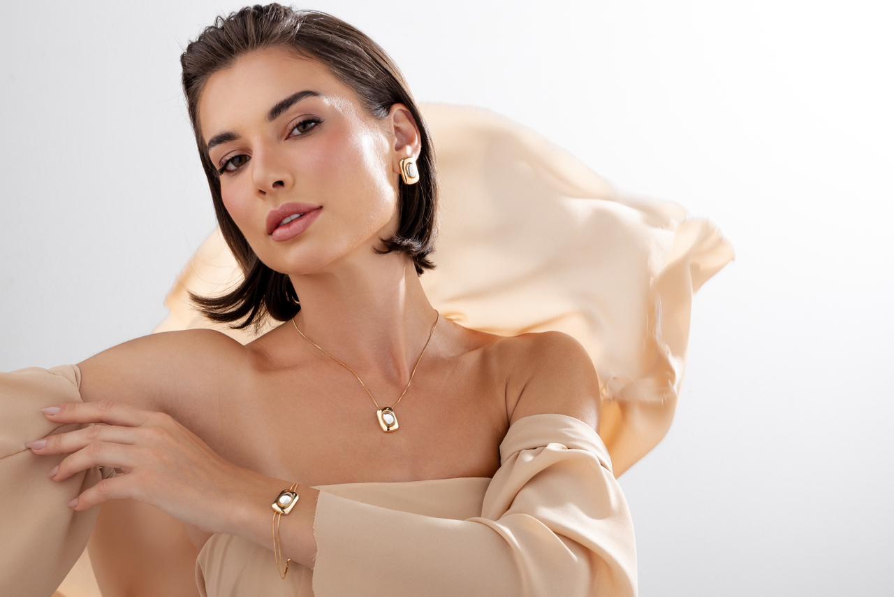 Conjunto Brinco e Colar Geométrico com Cristal– Banhado a Ouro 18k