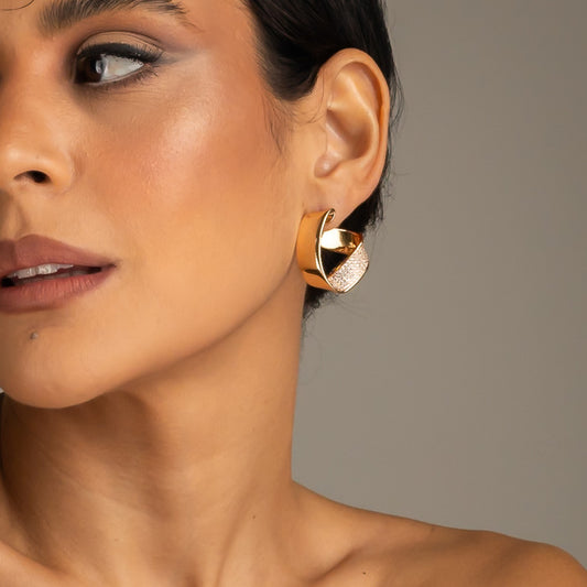 Brinco Dourado Argola frontal com Design Orgânico e Zircônias