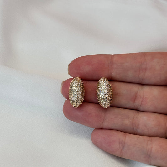 BRINCO MEDIO ZIRCONIA FRENTE 1 COLUNA GOTA OVAL ABAULADO CURVO 16X10X9MM BAN. DOURADO /INCOLOR