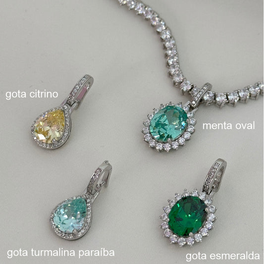 PINGENTE ESMERALDA OVAL PRATA 925 CRAVEJADO