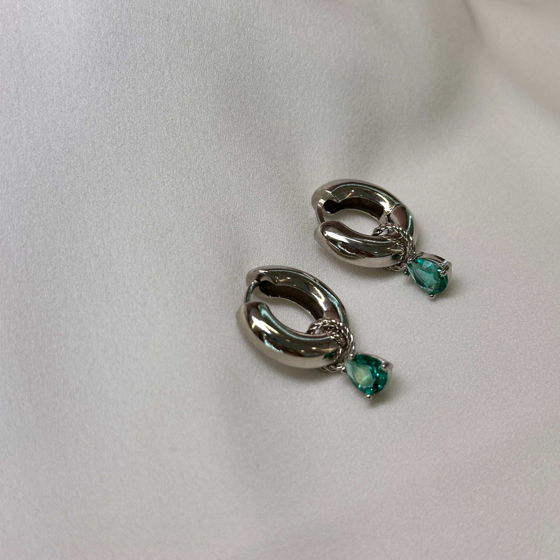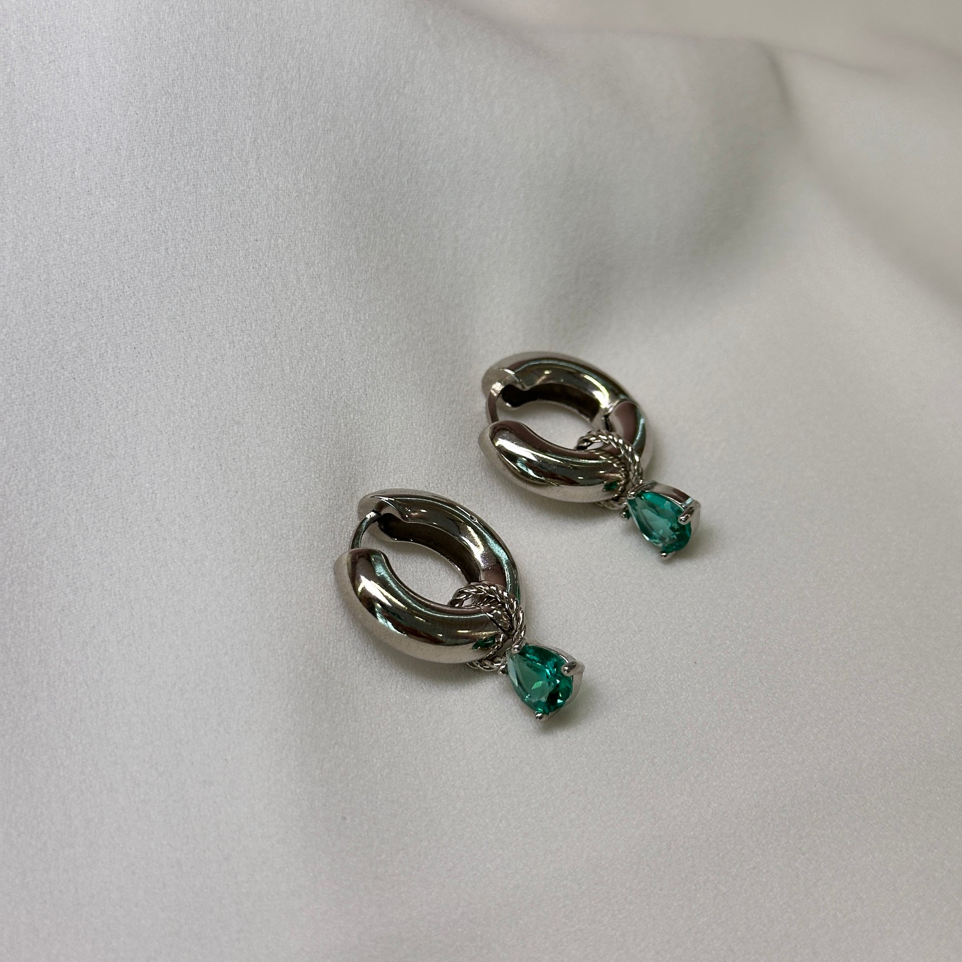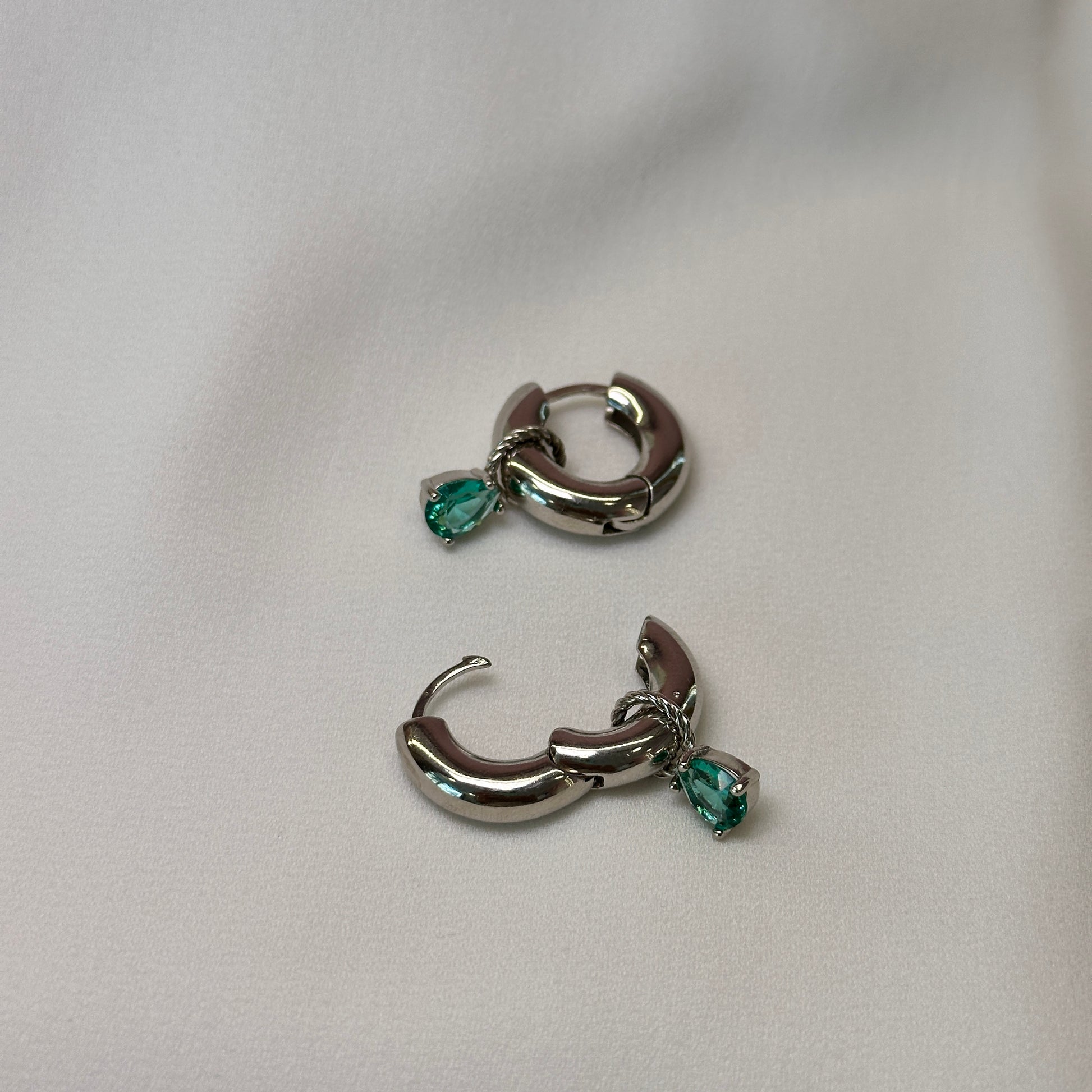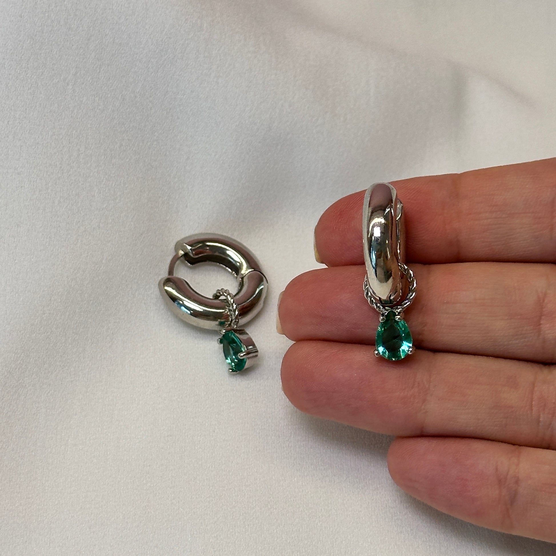Brinco argola ródio pequena com pedra verde