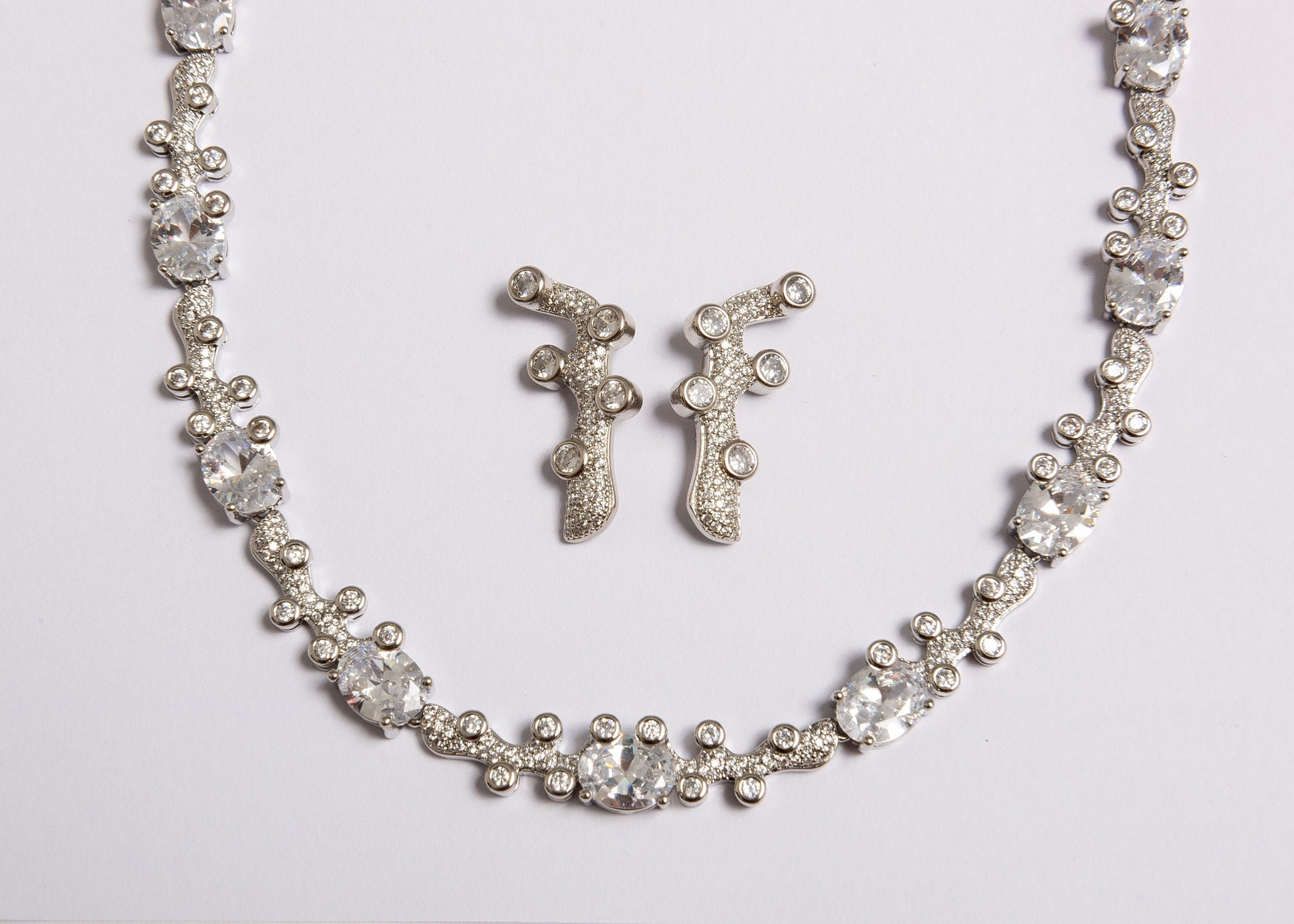 Luxuoso e absolutamente radiante, este conjunto com banho a ródio combina zircônias ovais de brilho intenso com delicadas esferas lapidadas que criam um desenho orgânico e artístico ao redor do pescoço. O colar apresenta uma sequência contínua de luz, com pedras maiores intercaladas por microcravações que garantem um acabamento premium e elegante.