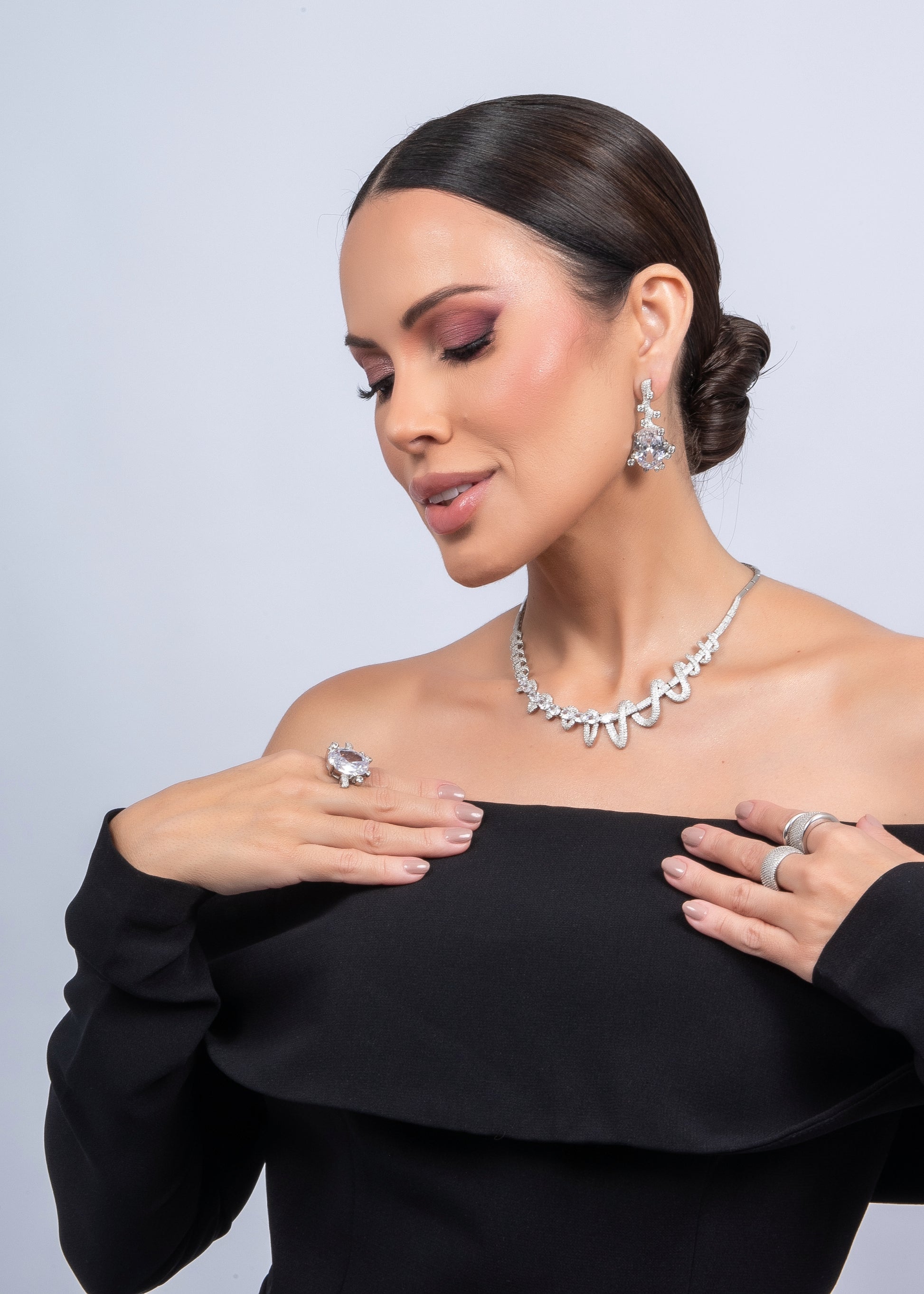 Um conjunto marcante e absolutamente sofisticado, perfeito para ocasiões especiais. O colar apresenta banho de ródio e um design orgânico exclusivo, com curvas fluidas totalmente cravejadas em microzircônias de brilho intenso. A combinação entre as formas onduladas e as pedras maiores intercaladas cria um visual moderno, glamouroso e de muito impacto.