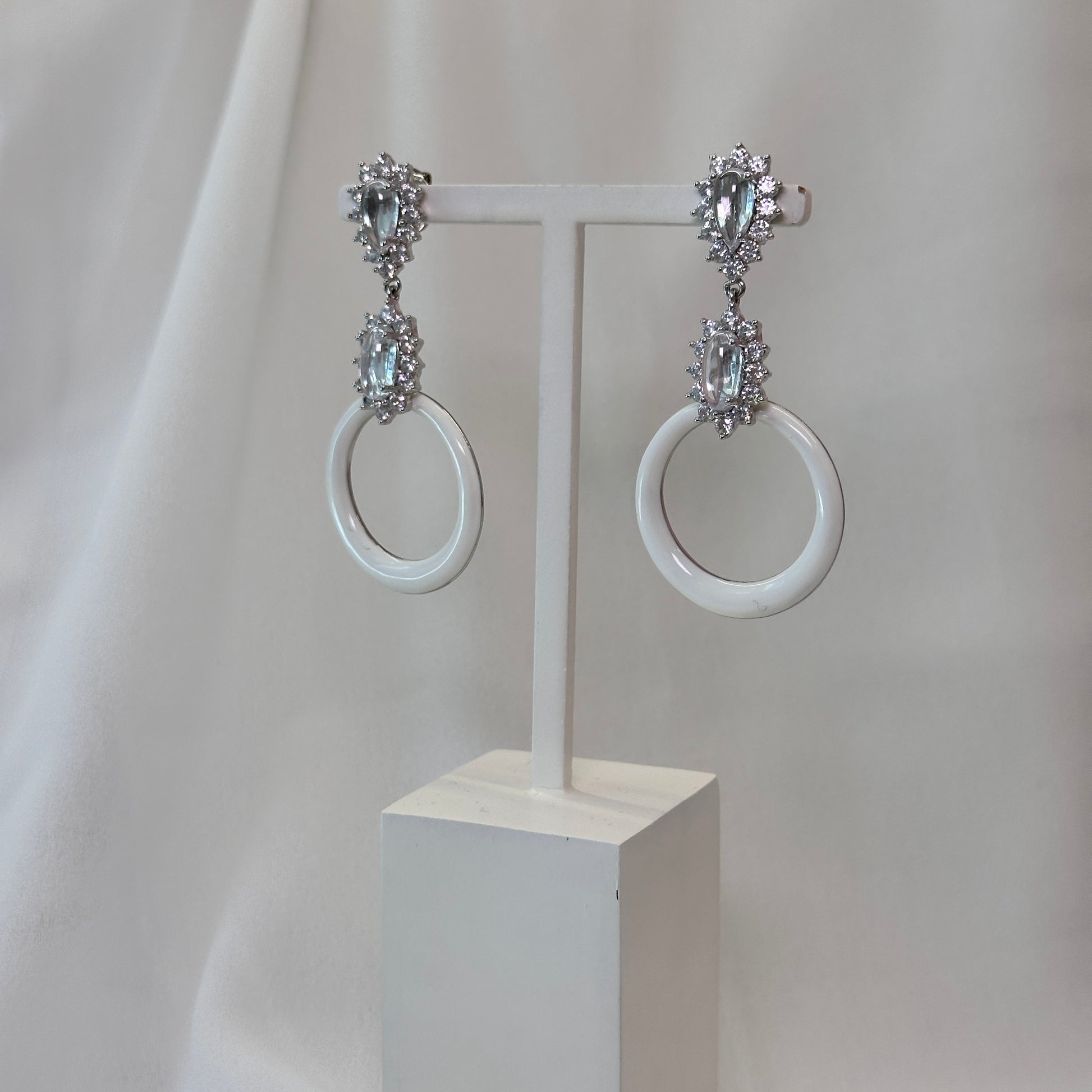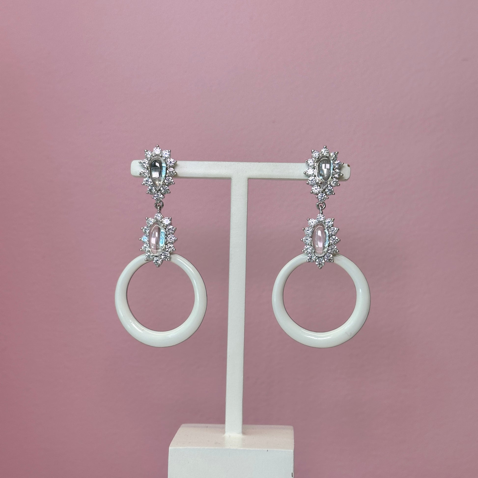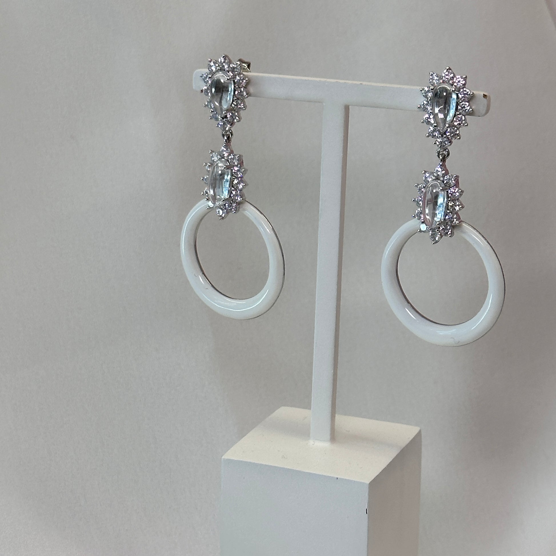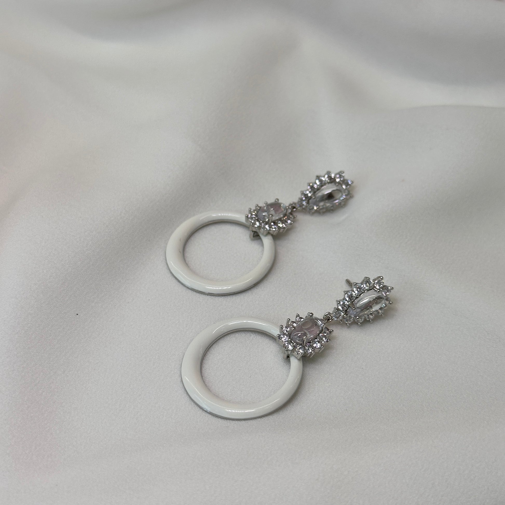 Brinco ródio alongado esmaltado branco com cristaos
