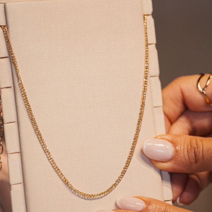 Adicione um toque de modernidade e sofisticação ao seu visual com este elegante colar de corrente groumet. Com seu design clássico e atemporal, a corrente groumet é perfeita para ser usada sozinha ou em camadas com outras joias, adaptando-se a diversas ocasiões e estilos. Este colar recebe um banho de ouro 18k de alta qualidade, que confere um brilho intenso e duradouro, além de proteger a peça contra o escurecimento e o desgaste.