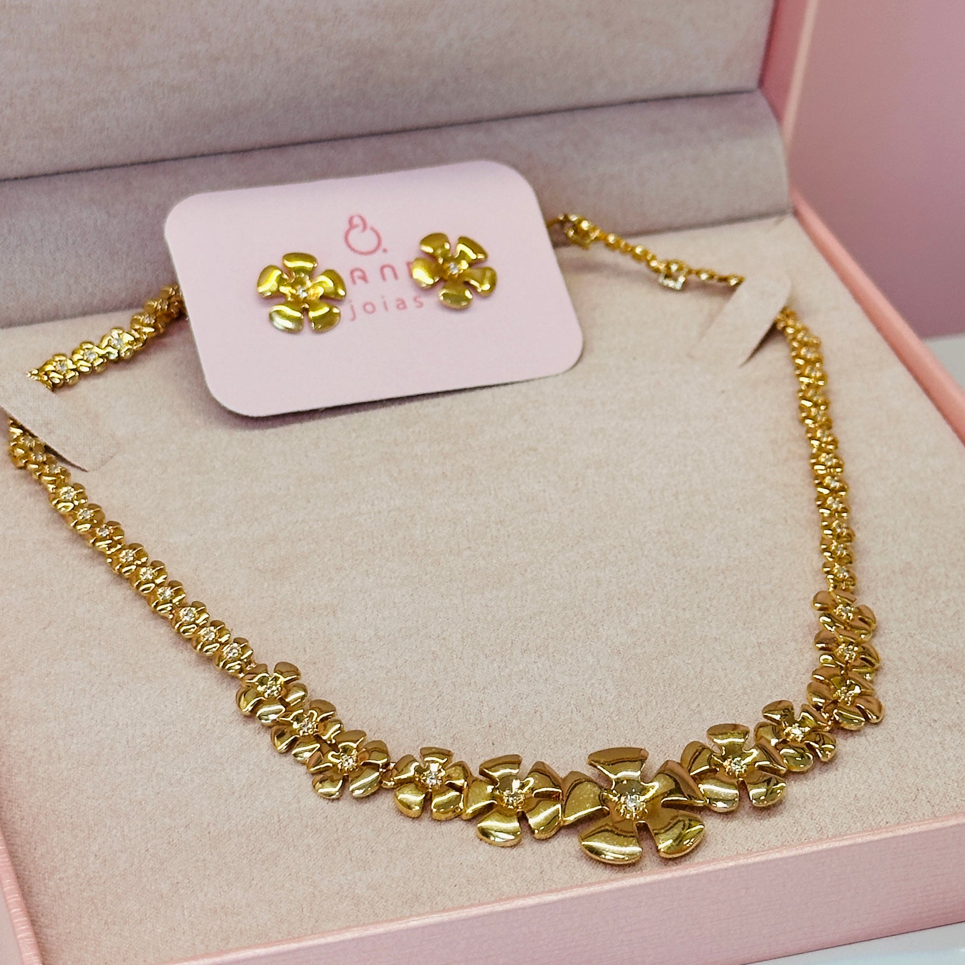 Conjunto Brinco e colar Florzinhas dourado com regulagem
